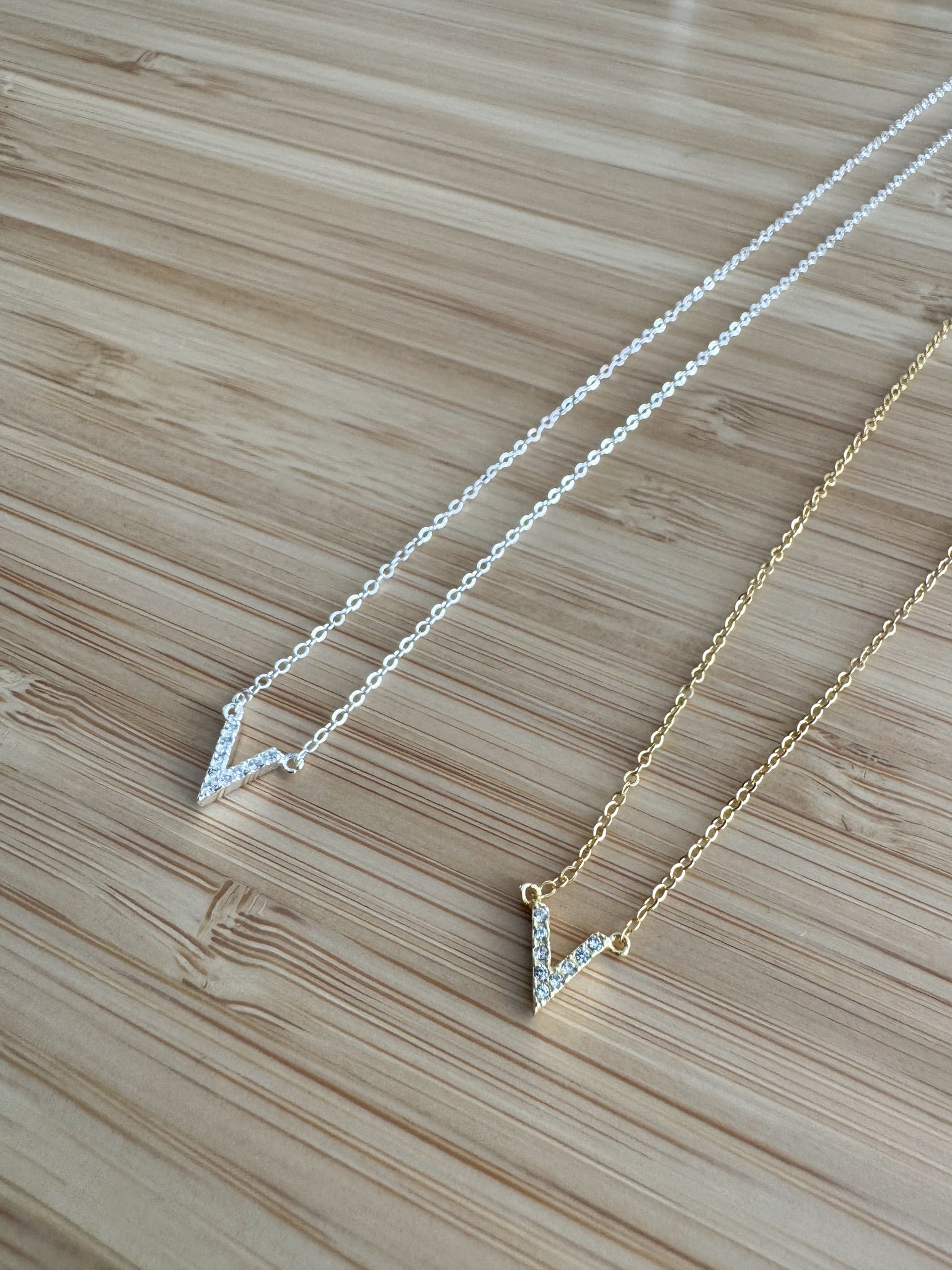 This Chevron Necklace adds a touch of elegance to any outfit with its dainty design and choice of gold plated sterling silver or sterling silver. Adorned with cubic zirconia studs, this necklace adds a perfect amount of sparkle to your look.