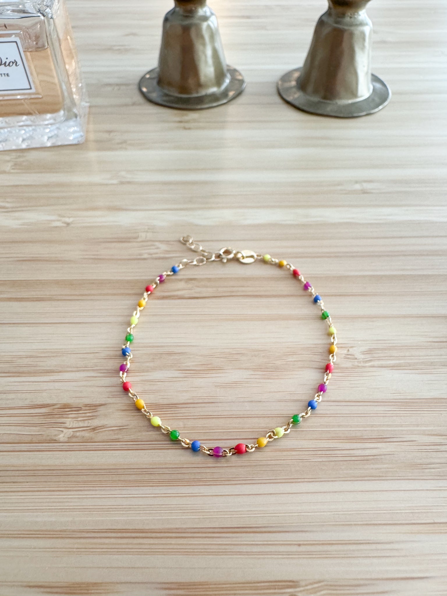 The Cleo Bracelet adds a playful touch to any outfit with its vibrant rainbow enamel chain. With a stylish design and eye-catching colors, this bracelet is perfect for those looking to add a fun and fashionable accessory to their wardrobe.